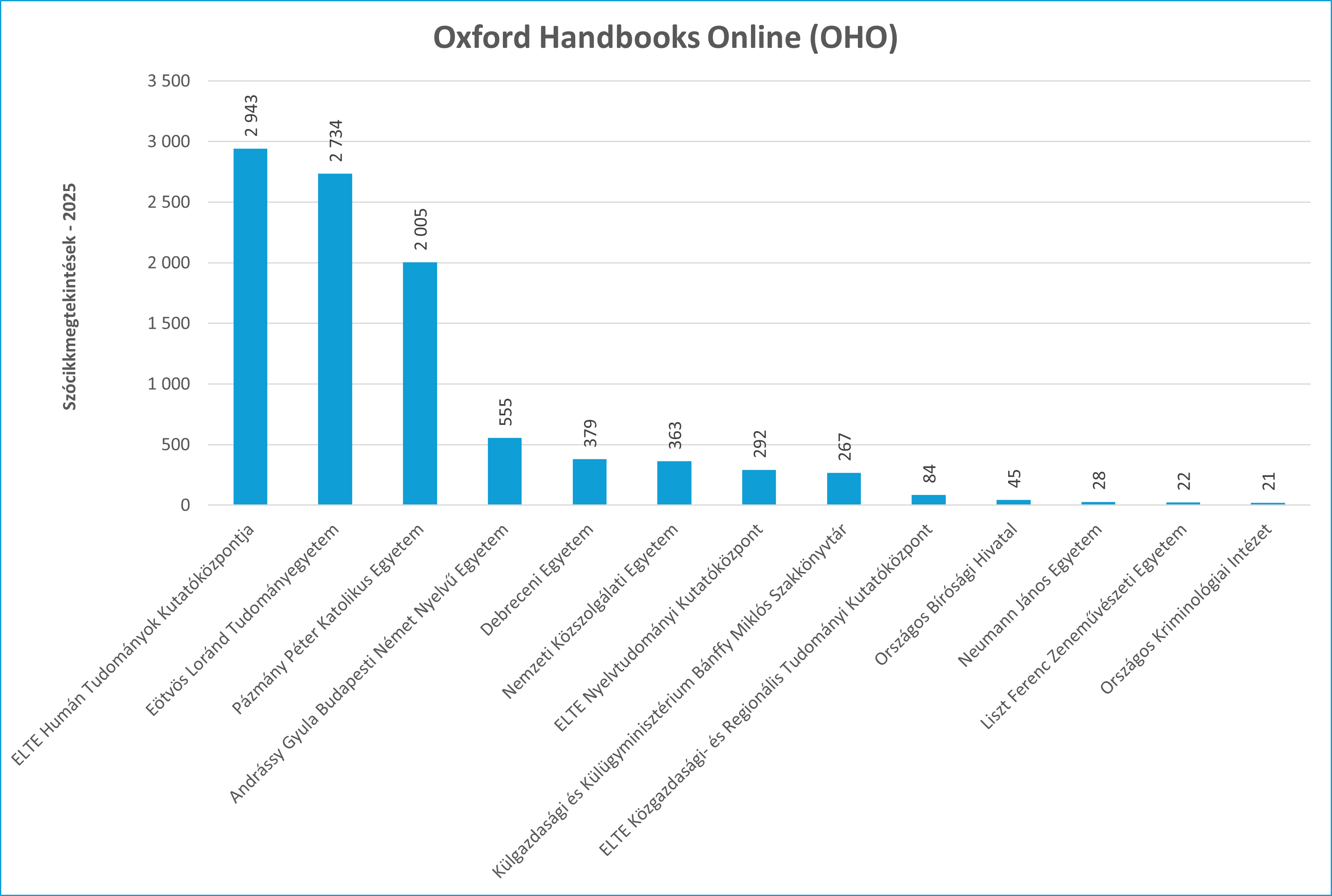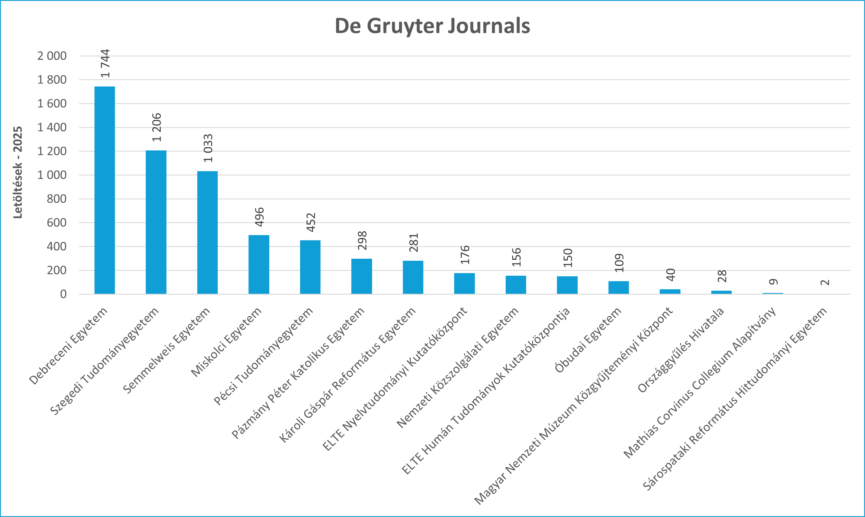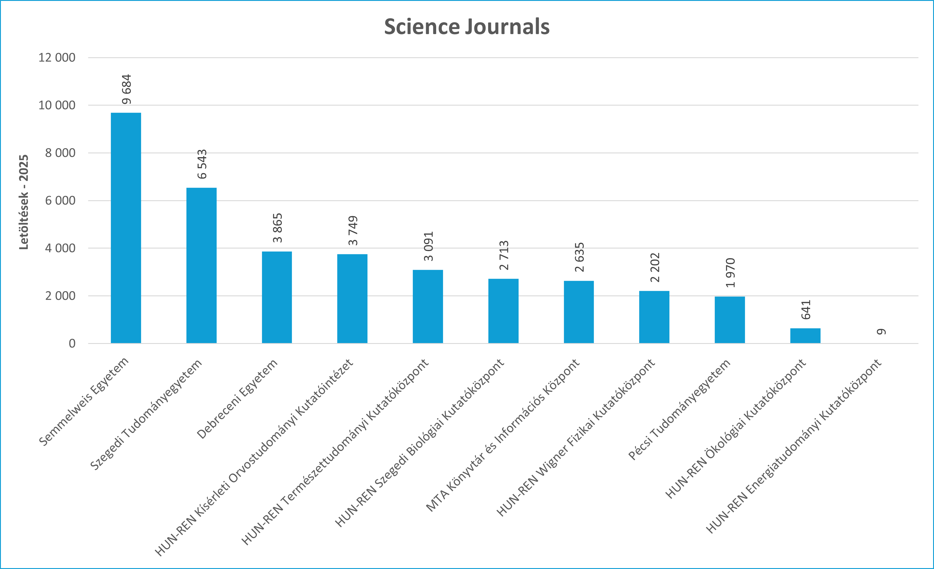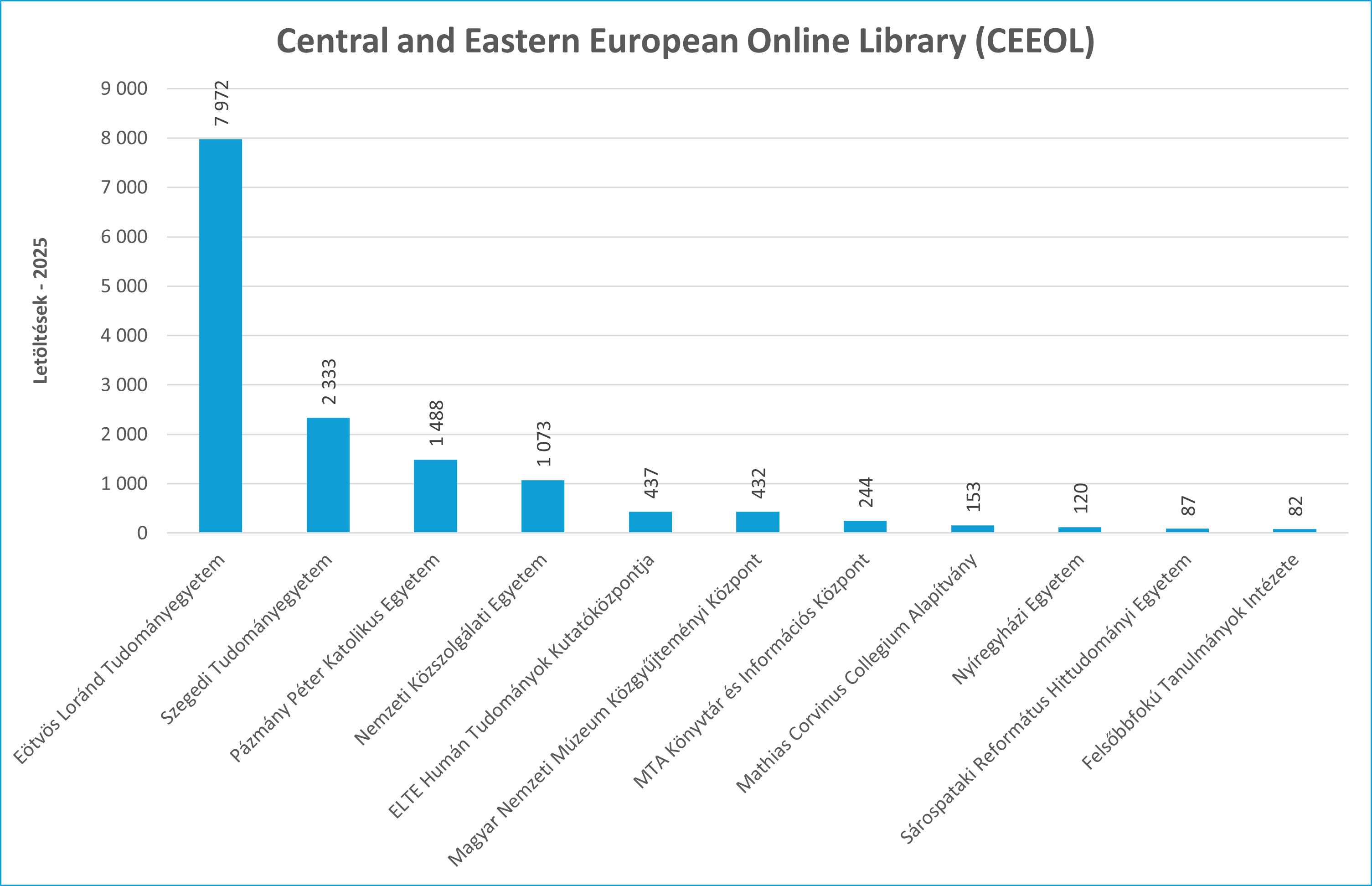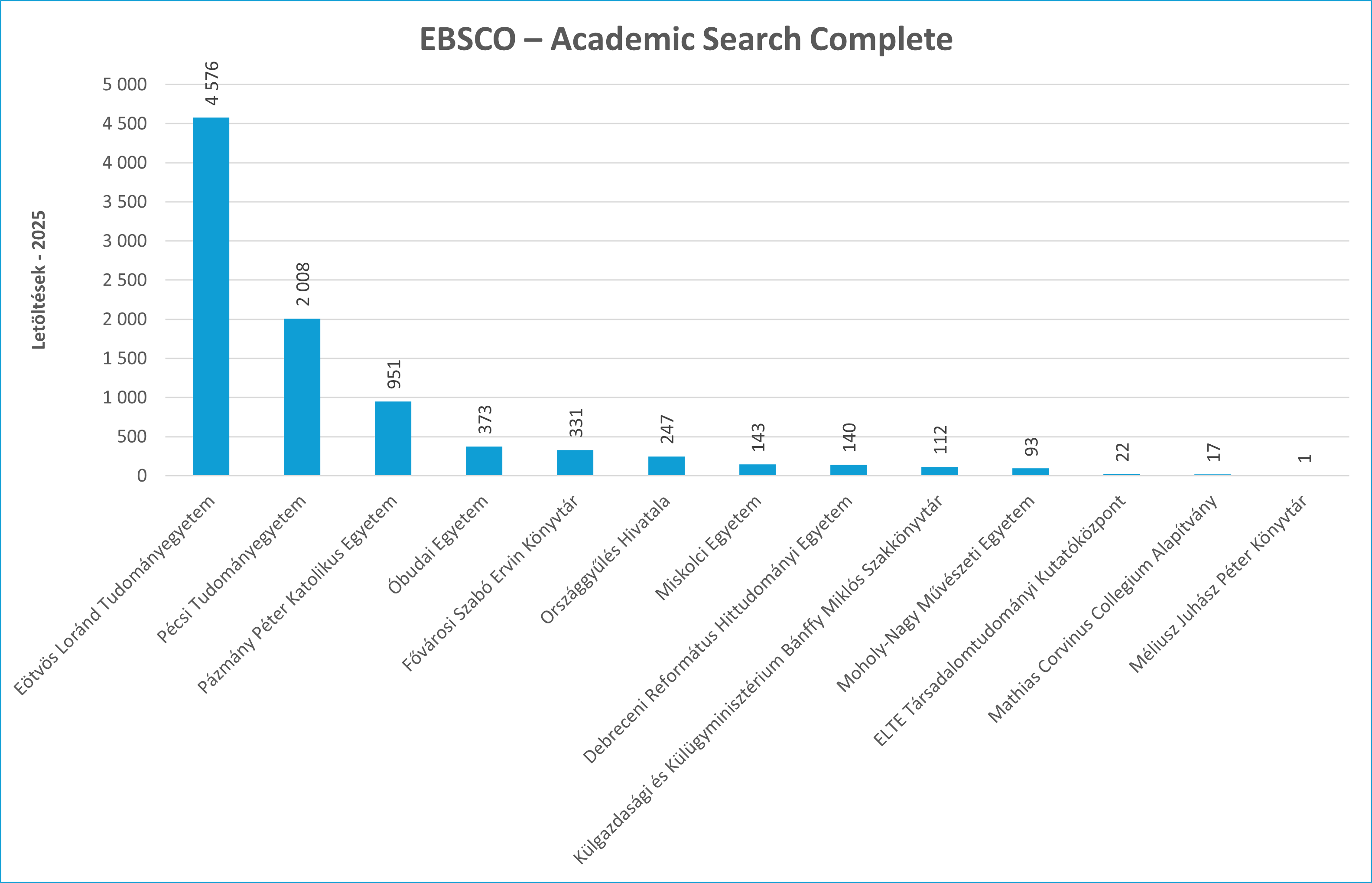 Adatbázisok: Akadémiai Digitális Archívum, Akadémiai Kiadó Folyóiratcsomag, Akadémiai Kiadó Magyar Elektronikus Referenciaművek Szolgáltatása (MeRSZ), Akadémiai Kiadó Szótárai, American Chemical Society (ACS Journals), Annual Reviews, Argumentum Kiadó, ATLA Religion Database with ATLASerials, Attraktor Kiadó, Balassi Kiadó, BMJ, Brill Bibliography of the History and Archaeology of Eastern Europe in the Middle Ages, Brill Book History Online, Brill Encyclopedia of Early Christianity Online, Brill Encyclopedia of Jewish History and Culture Online, Brill International Law & World Order, Brill Jacoby Online, Brill Journals, Brill New Pauly Online, Brill Religion Past and Present Online, Brill´s Encyclopedia of China Online, Brill's Medieval Reference Library Online, CAB Abstracts, CAB Abstracts with Full-Text,Cambridge University Press, CEIC, Central and Eastern European Online Library (CEEOL), Clarivate Analytics – InCites, Clarivate Analytics – Journal and Highly Cited Data (JHCD), Clarivate Analytics – Web of Science, De Gruyter Journals, De Gruyter – Artists of the World, De Gruyter – Bibliotheca Teubneriana Latina Online, De Gruyter – Building Types Online, De Gruyter – Encyclopedia of the Bible and Its Reception Online, De Gruyter – Thesaurus Linguae Latinae Online, EBSCO – Academic Search Complete, EBSCO – Academic Search Ultimate, EBSCO – Art and Architecture Source, EBSCO – Business Source Complete, EBSCO – Business Source Premier, EBSCO – Business Source Ultimate, EBSCO – Econlit with Full Text, EBSCO – Education Research Complete, EBSCO – Education Source, EBSCO – International Bibliography of Theatre & Dance, EBSCO – Legal Source, EBSCO – Political Science Complete, EBSCO – Religion & Philosophy Collection, EBSCO – RILM, EBSCO – SocINDEX with Full Text, Elsevier – Clinical Key, Elsevier – Embase, Elsevier – Reaxys, Elsevier – ScienceDirect, Elsevier – SciVal, Elsevier – Scopus, Elsevier – Scopus AI, EmeraldInsight, EMIS, Gondolat Kiadó, GALE OneFile, GALE Literature, GALE Research Complete, HeinOnline, IEEE, IOPScience, IOPScience – e-könyvek, JSTOR, JSTOR - Artstor, Kalligram Kiadó, Kortárs Kiadó, Kossuth Kiadó, Kriterion Kiadó, Kronosz Kiadó, L’Harmattan Digitális Adatbázis, Lippincott Williams and Wilkins, Magyar Napló Kiadó, Martin Opitz Kiadó, MathSciNet, Mentor Könyvek Kiadó, MMA Kiadó, Múlt és Jövő Kiadó, Nap Kiadó, Napvilág Kiadó, Osiris Kiadó, Oxford Art Online (Grove Art Online), Oxford English Dictionary Online, Oxford Handbooks Online (OHO), Oxford Music Online (Grove Music Online), Oxford Public International Law (OPIL), Oxford University Press Journals, Project MUSE, Proceedings of the National Academy of Sciences of the United States of America (PNAS), ProQuest – Academic Complete, ProQuest – Art Design and Architecture Collection, ProQuest Central, ProQuest – Early English Books Online, ProQuest – One Academic, ProQuest – One Literature, ProQuest Science and Technology Ebook Collection, ProQuest – SciTech Premium Collection, PsycARTICLES, PsycInfo, Royal Society of Chemistry (RSC) Gold, SAGE Journals, Sage Research Methods, Science Magazine, SciFinder Discovery Platform, Springer Nature – Nature, Springer Nature – SpringerLink, SpringerLink – e-könyvek, Statista, Szaktudás, Századvég Kiadó, Szent István Társulat, Tarsoly Kiadó, Taylor & Francis Online, TINTA SzakKönyvTár, TINTA SzóTudásTár, TIT Gondolat Kiadó, Typotex – Interkönyv, Ulrichsweb, UpToDate, USC SOÁ Alapítvány Vizuális Történelmi Archívum, Vince Kiadó, Wiley Online Library, Wiley – The Cochrane Library, World Politics Review